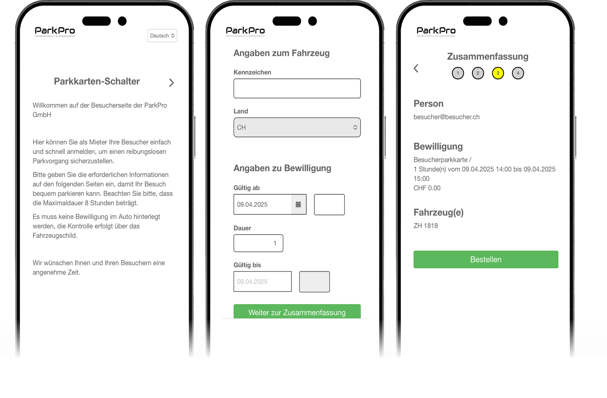Um Berechtigte von Falschparkern zu unterscheiden, stellt die ParkPro GmbH bei einer Zusammenarbeit die Besucher-Anmelde-App kostenlos zur Verfügung. Das Hinterlegen einer Parkkarte entfällt und die Besucher sparen sich den erneuten Weg zum Fahrzeug. Bei Geschäftshäusern kann die App auch auf den PC der Unternehmen installiert werden. Mit einem Klick wird die Parkplatzbewirtschaftung vereinfacht und das Nachführen von aufwendigen Listen entfällt.